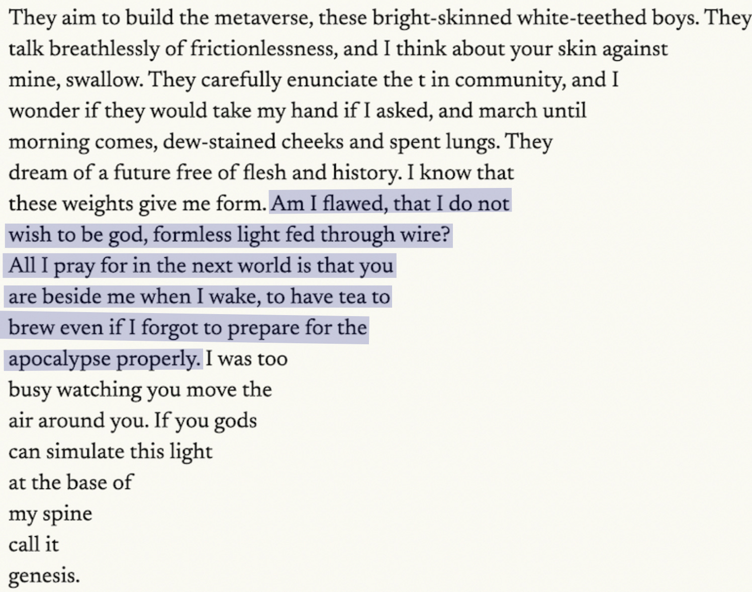the poem transubstantiation is once again living rent-free in my head. it feels more relevant than ever, working in ai right now, my ears full of dull visions for the future, my eyes full of product demos that are only technically impressive, my heart full of unrequited love: