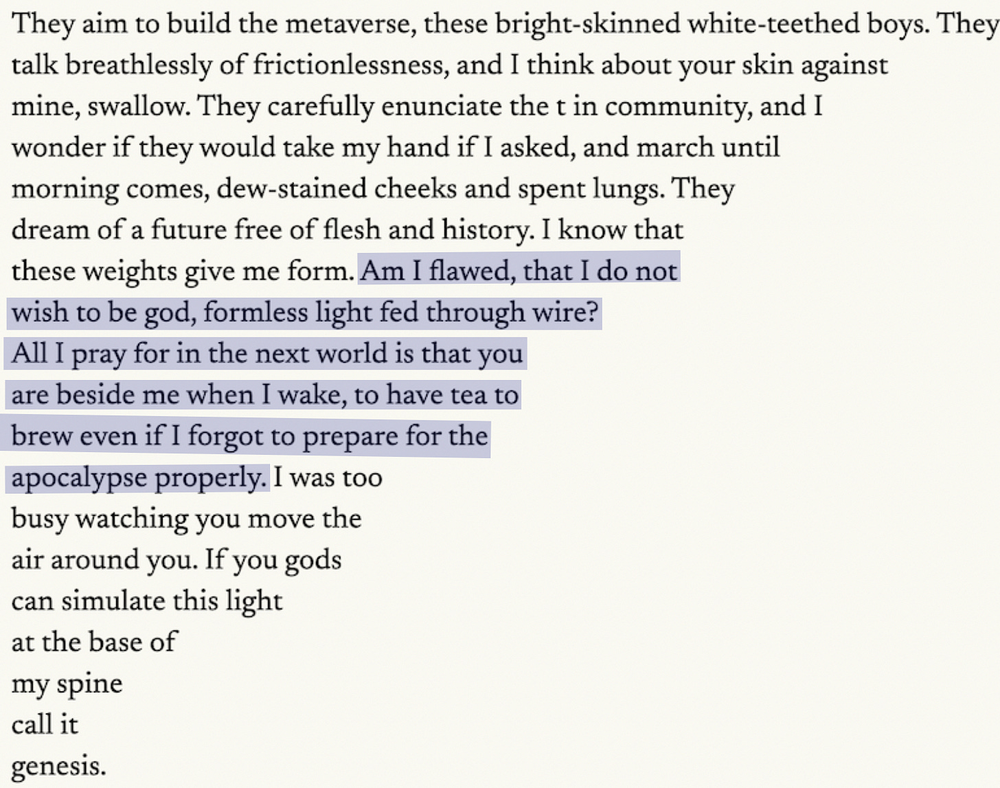 it’s strange to think that at this time last year i was an accelerationist. i remember being irrationally excited for the release of gpt4 and the wave of apps it would enable. looking back i don’t think any of that came from a place of genuinely caring about technology; instead i think i was so fed up with the world i was living in that i wanted to do whatever i could to smash it to pieces - to end the inequalities of capitalism and american “democracy” and so on - and agi was the most convenient hammer to smash everything with. it wasn’t a very thoughtful position, but i don’t apologize for having taken it. A child who is not embraced by the village will burn it down to feel its warmth. and so i can’t help but wonder - to what extent is accelerationism today fueled by that same angst, by feeling unloved, by resentment towards the present? do all these people on tech twitter really wish to be god, formless light fed through wire, or do they just hate themselves?