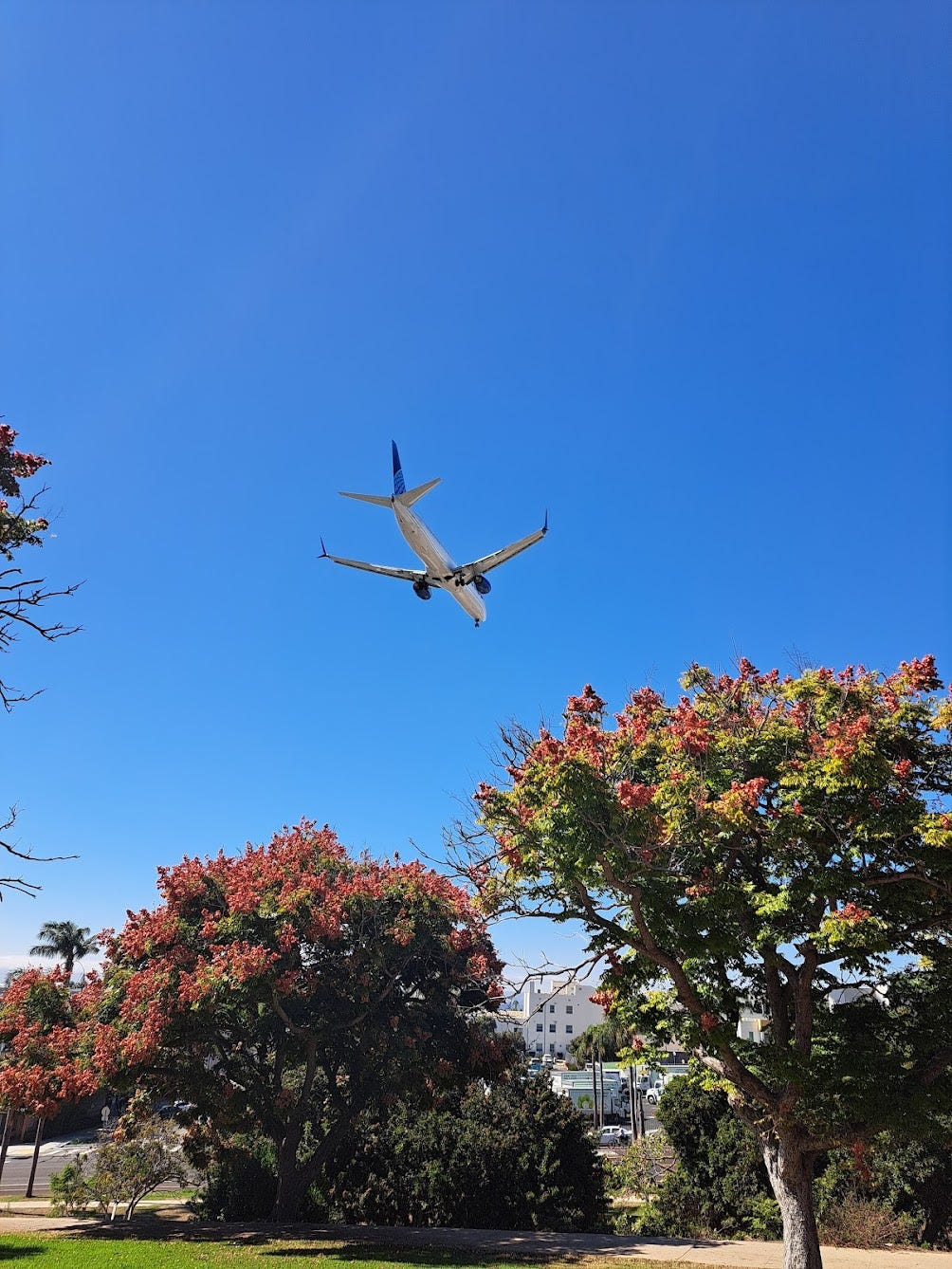 one observation about the san diego airport is that it is directly adjacent to both downtown and the san diego bay, so there is only room for a single runway - highly unusual for such a large city (for reference, similarly busy airports like nashville and philadelphia have four runways). this means every flight that lands in san diego has to descend along the exact same path, so every few minutes an airplane passes over balboa park, quite close to the ground and quite visible as a result (i estimated an altitude of ~200 meters)