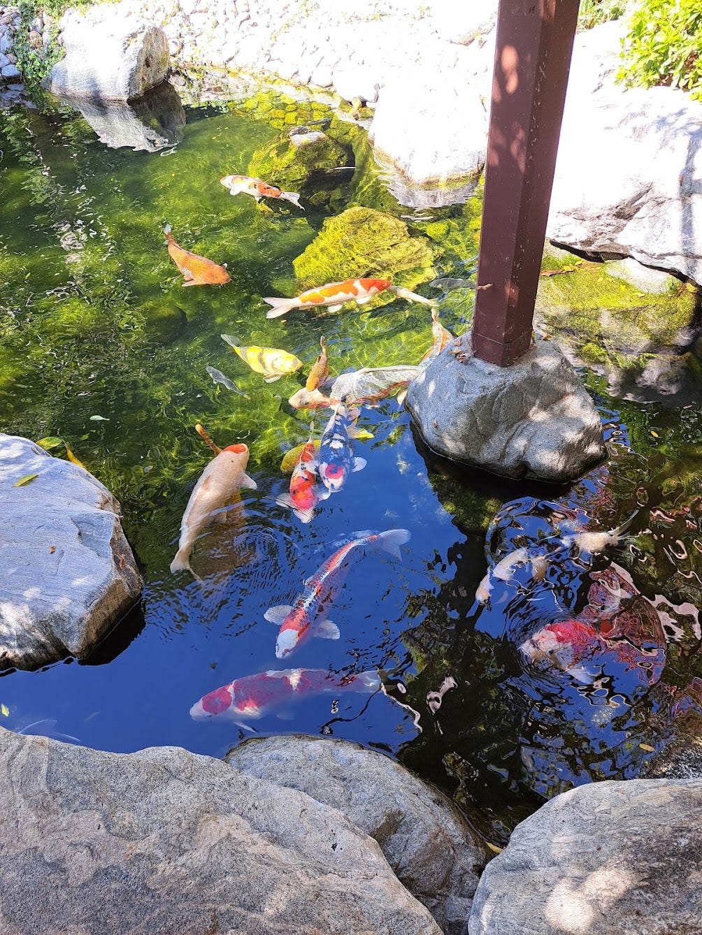 there were several ponds filled with koi fish, and i watched them for around half an hour. i had not previously realized that koi symbolize love and friendship, or that they occasionally rise above the surface of the water to get more oxygen, or that they enjoy bumping into each other