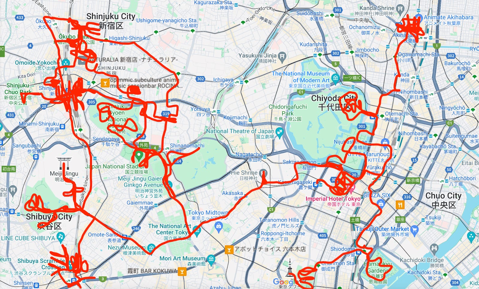walked around very aggressively. here is one of my walking maps, for the shinjuku / shibuya / chiyoda area: