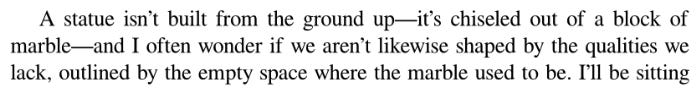 it put into words something i’d been feeling for a long time, namely that saving feelings to write about later doesn’t work: “One of the things I know about writing is this: spend it all, shoot it, play it, lose it, all, right away, every time. Do not hoard what seems good for a later place in the book or for another book; give it, give it all, give it now. The impulse to save something good for a better place later is the signal to spend it now. Something more will arise for later, something better. These things fill from behind, from beneath, like well water. Similarly, the impulse to keep to yourself what you have learned is not only shameful, it is destructive. Anything you do not give freely and abundantly becomes lost to you. You open your safe and find ashes.”