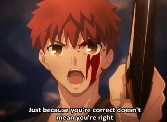 i’ve heard this anime suffered from a number of japanese-to-english translation problems (in another scene the same character says “people die if they are killed”). i find the mistranslation to be surprisingly relevant though. i have been correct very often in my life; i have been right much less often