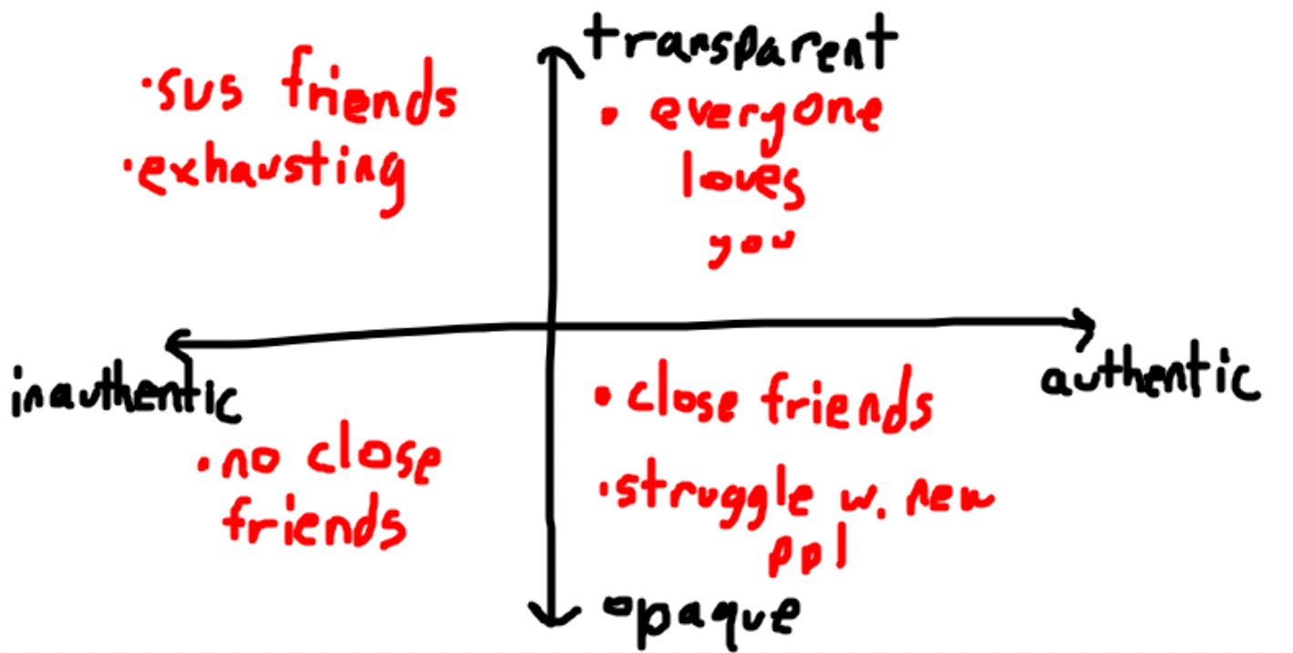 explanations of other quadrants: some people are extremely good at being both authentic and unfiltered around strangers, eg. my former boss, which makes it very easy to connect deeply with people they’ve just met. some people seem very open and engaging around strangers but are really doing a lot of work to maintain appearances (eg. pretending to be interested in a topic, matching energy and mannerisms, filling gaps in conversations to avoid silence) so strangers often like them but socializing is very exhausting on their part, and it’s easy to end up with “friends” that are actually not very compatible. i can’t think of anyone who is both extremely opaque and inauthentic, which may be a case of selection bias (would i ever end up being friends with such a person?)