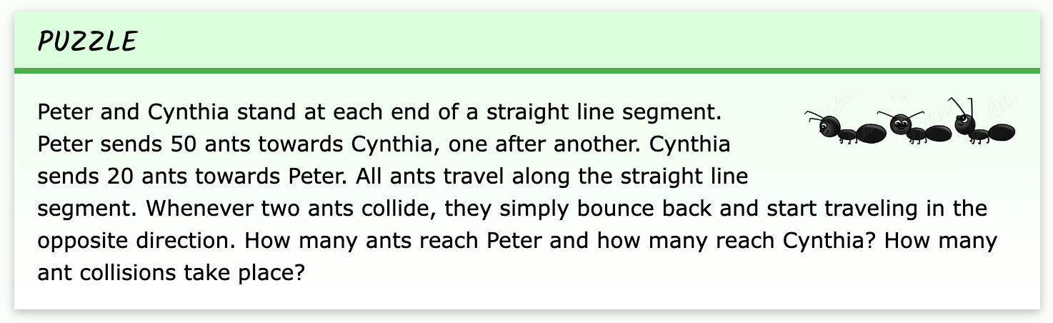 (if you try to trace out the path of each ant this puzzle becomes very complicated. the key insight is to note that the ants are identical, so two ants colliding and turning around is equivalent to them walking past each other, and then it’s obvious that 20 ants reach peter, 50 ants reach cynthia, and there are 1000 total collisions)